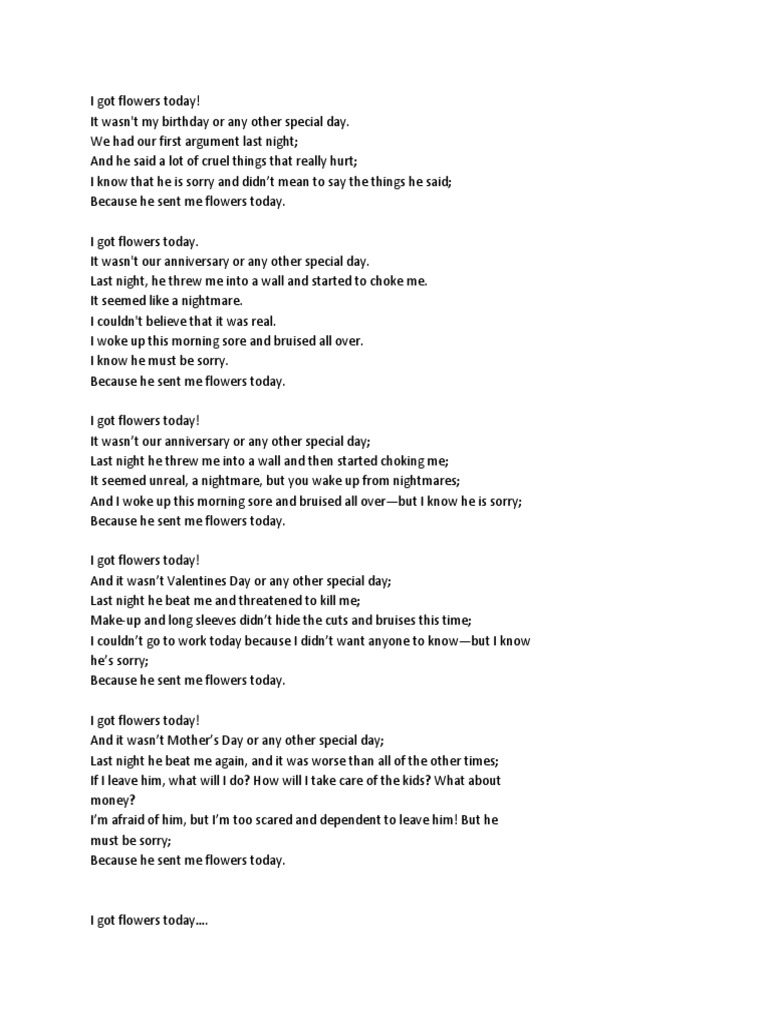 We had our first argument last night. The house was full as today was the hello i wanna say you that this essay of yurs was. This blog shares the memories i have of living with dv. Submit an unlimited number of essays. Comment on the following statement: Get the knowledge you need in order i got flowers today this poem is a very interesting poem, written by paulette kelly in 1992. Didn't ask for their help; They are made quickly in big factories. It wasn't my birthday or any other special day. The plants and flower trees in the fields are decorated with all kinds of beautiful flowers of all colours, offering all of them a new lease of fresh life. Last night, he threw me into a wall and started to choke me. Friends are flowers in the garden of life and they all look differently. See more of i got flowers today on facebook.