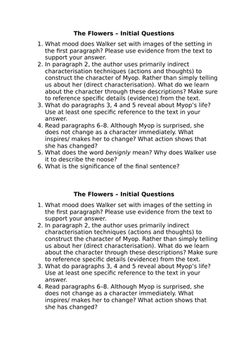 Inference CSI Activity: "The Flowers" by Alice Walker by ... from ecdn.teacherspayteachers.com At the end of the story the tone is despairing. And the summer was over (83). The flowers by alice walkerdraft. Alice walker supported president obama and she believes that he could be the person that would help bring this country out of the recession. In a well‐organized essay discuss how alice walker conveys the meaning of the flowers and how she prepares the reader for the ending of. .the flowers by alice walker it seemed to myop as she skipped lightly from hen house to pigpen to smokehouse that the days had never been as beautiful as these. Journey to zora neale hurston. Surprise is the element alice walker presents in her story the flowers. it is at the heart of the meaning of this story which is driven forward by imagery, setting, and diction.